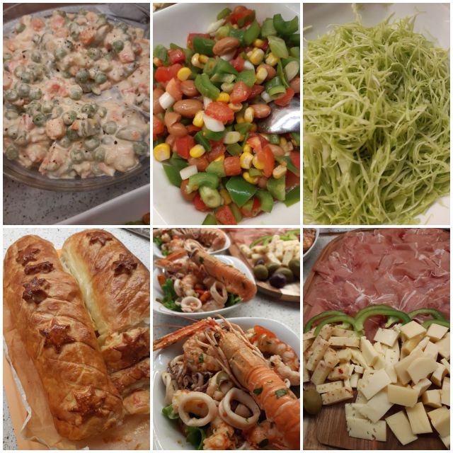 Zgodnja večerja v krogu razširjene družine- morska solata z lignji, gamberi in škampi, narezek s pršutom in siri, puranja rolada s pršutom in sirom v listnatemu testu, medaljončki svinjske ribice v omaki zelenega popra, piščanji pohančki, pečen krompir, solate, drožni kruh ( nekaj slik je le uspelo)