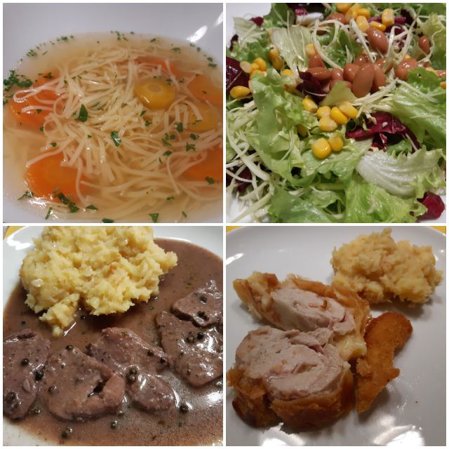 goveja juha s knedli, mrežna pečenka, pohan piščanc, sv. ribica v panceti, domači mlinci, pražen krompir, riž, zeljnata solata s fižolom, potica, piškoti in kavice