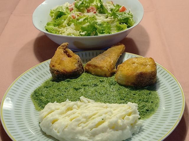 Pečen oslič, pire krompir, špinača; mešana solata; tortica (iz Leclerka)