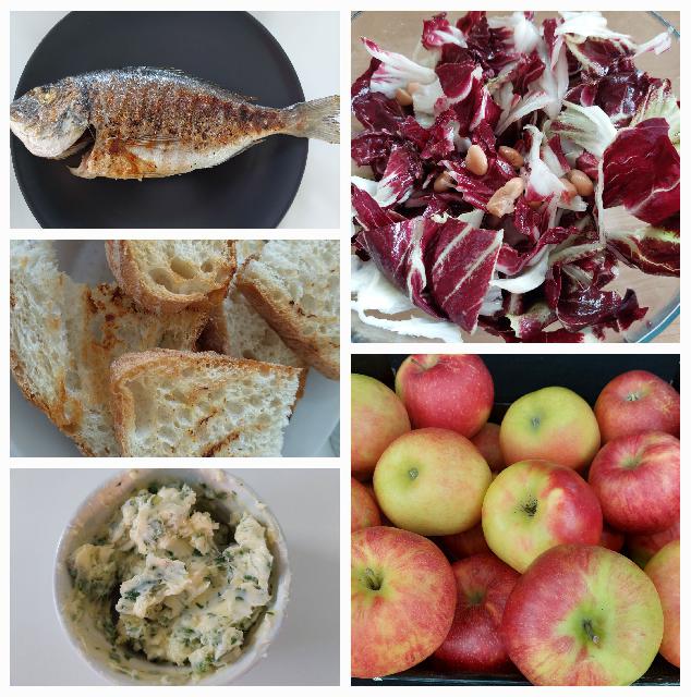 Orada, kruhki z zeliščnim maslom, radič in jabolka in orehi skozi cel dan ![]()