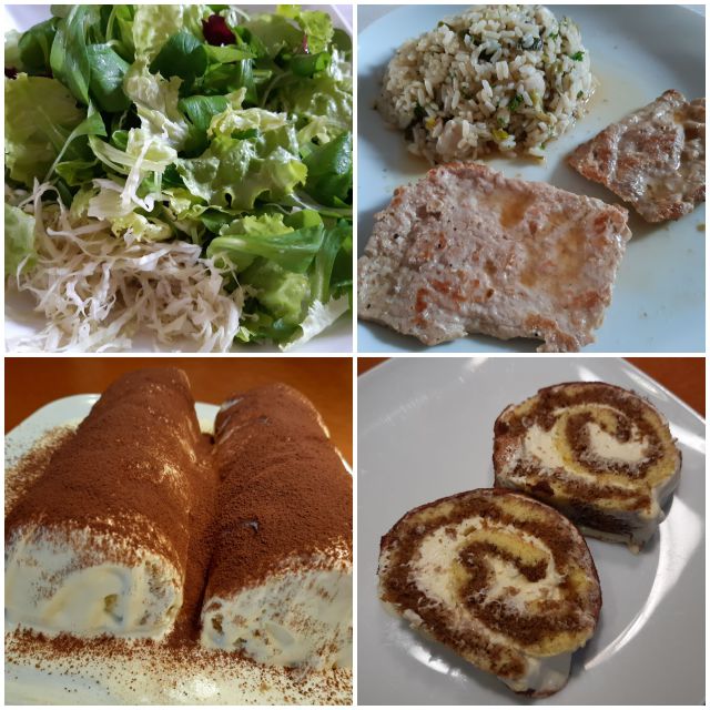 Danes zrezki, rižota z jurčki in porom, solata. Za sladico sem pripravila tiramisu rolado- najnovejši recept na kulinariki CakeOClock_Urška.. malce sem priredila recept in bila je odlična.