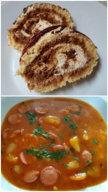 Danes krompirjev golaž s hrenovko, kruh, tiramisu rolada