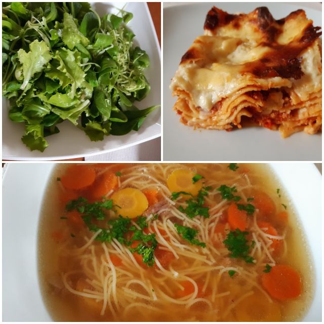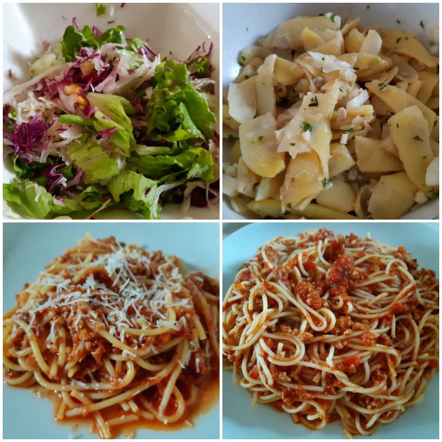 Včeraj špageti bolognese, zame brezglutenski, stročji fižol v solati, mešana solata