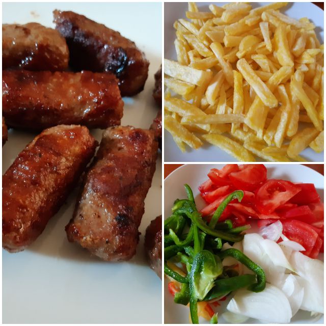 Danes čevapčiči, pomfri, zelenjava, kruh