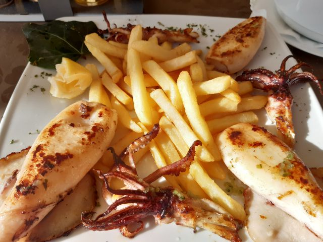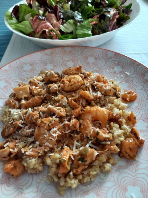 Goveje-kurja juhica (od včeraj); morski sadeži na bulgurju; radič s krompirjem in ocvirki
