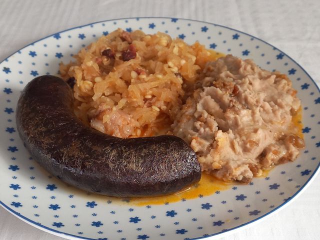 Danes, bučna hokkaido juha od včeraj, pečenice, ajdovi žganci, kisla repa, jabolčna pita z orehi