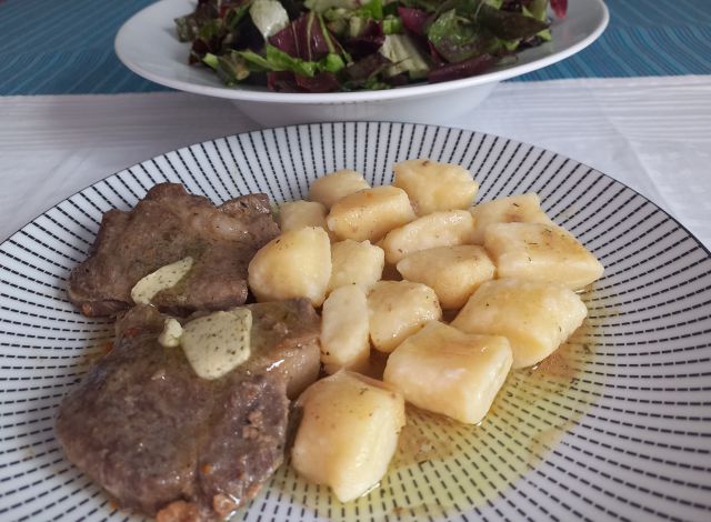 Sv. zrezki v omaki, po vrhu zeliščno maslo, njoki; radič s krompirjem; orehovo pecivo