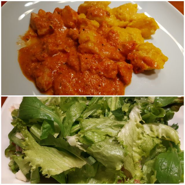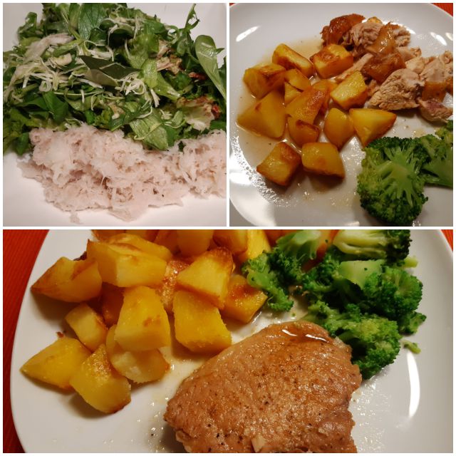 Prejšnji ponedeljek - bučni žličniki s skuto ( malo so se razlezli), piščančnji in svinjski koščki v omaki, solata
