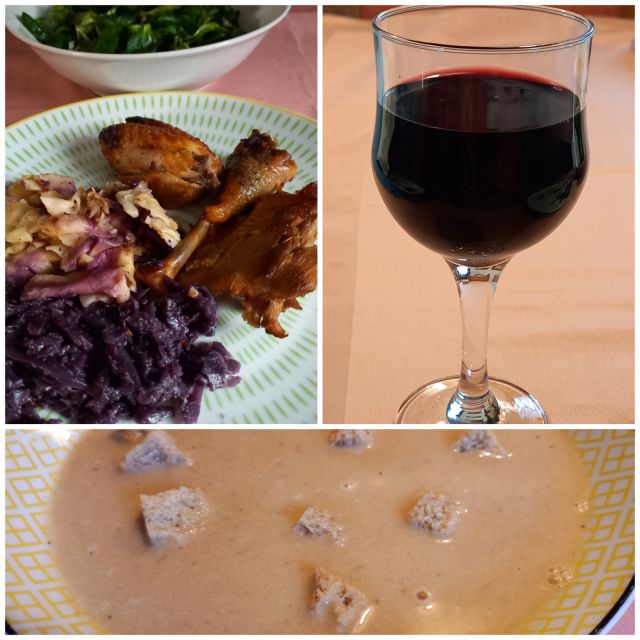 Bučna juhica s krutoni; ostanki od včeraj, motovilec; kozarec vinčka
