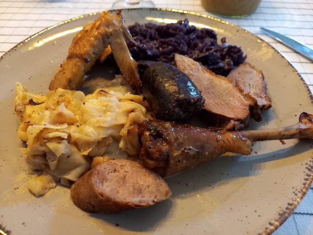 pečen piščanec, račja prsa, krvavice, mlinci, rdeče zelje;