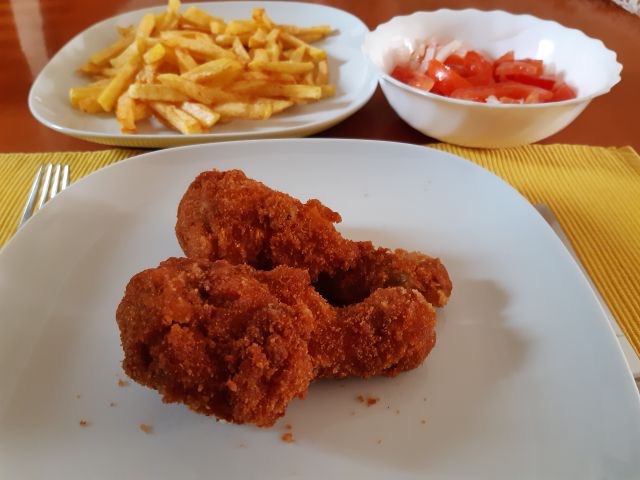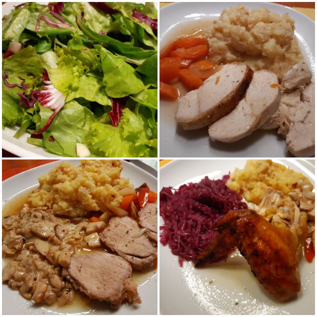 Včeraj pečena svinjina, pečen kos piščanca, rdeče zelje z jabolki, jurčki v omaki, pražen krompir, solata