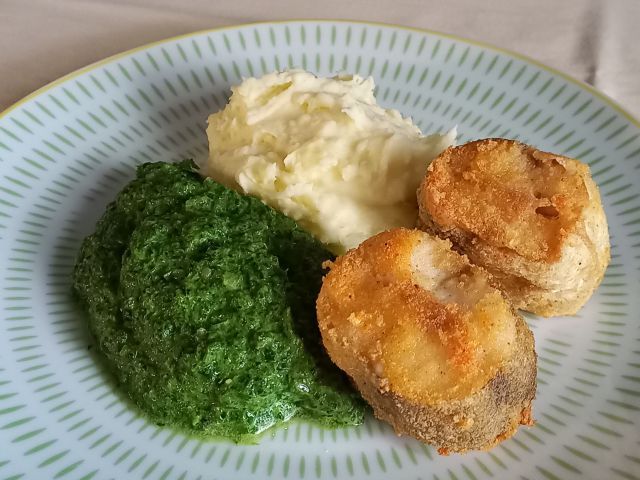Včeraj: zelenjavna juha, kuhan krompir, špinača, oslič iz pečice, motovilec