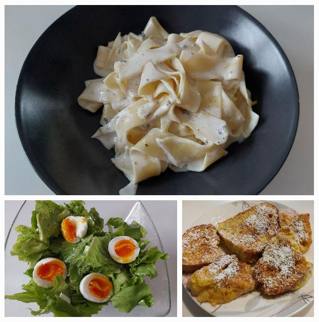 Včeraj - testenine s tartufi, solata z jajci in kuhovi ocvrtki s cimetom pozno popoldne: