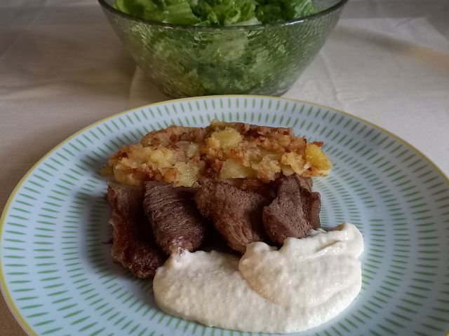 Goveja juhica; pražen krompir z ocvirki, hrenov zos, popečena gov. iz juhe; zelena solata