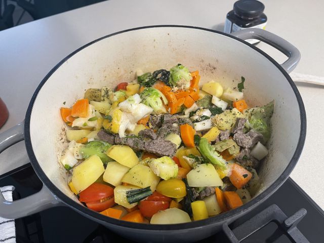 Danes emolončnica s krompirjem govedino in zelenjavo, slikano se med kuho🙈. Zraven se radič v solati in sveže pečen kruh iz lonca. Potica za sladico ter kozarec chiantija.