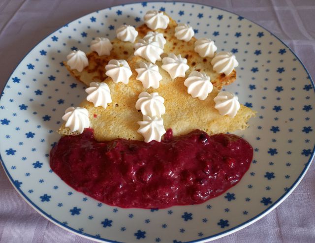 Enolončnica; palačinke z orehi, gozdnimi sadeži in smetano
