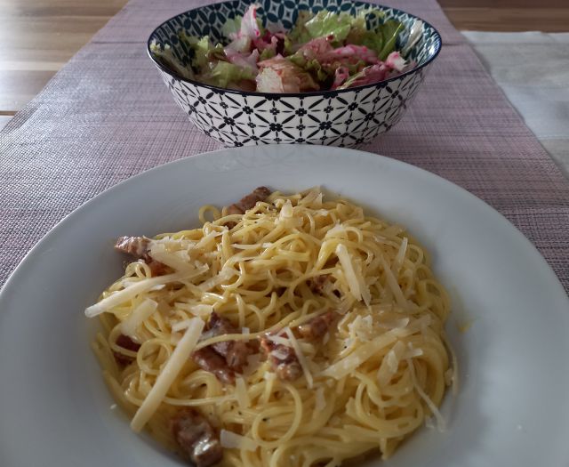 Špageti a`la carbonara; zelena solata, rdeča pesa