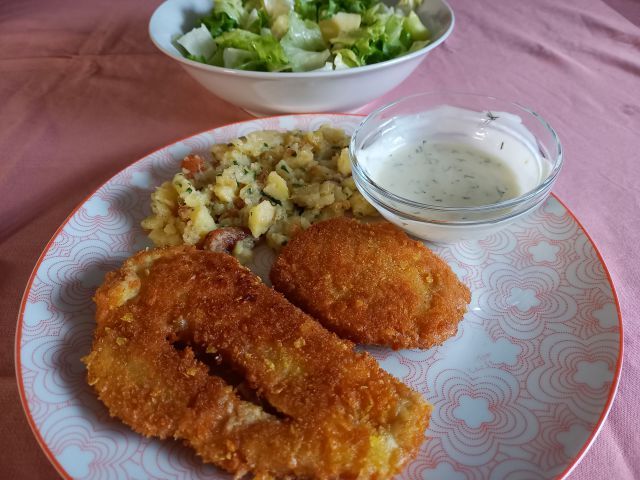 Pražen krompir, paniran puranji file, koprov zos; štrucar radič