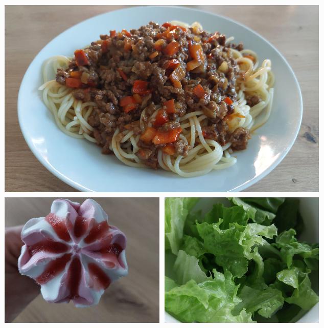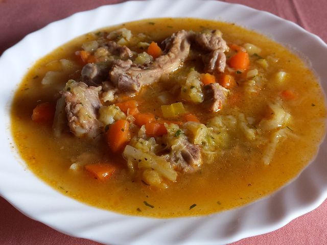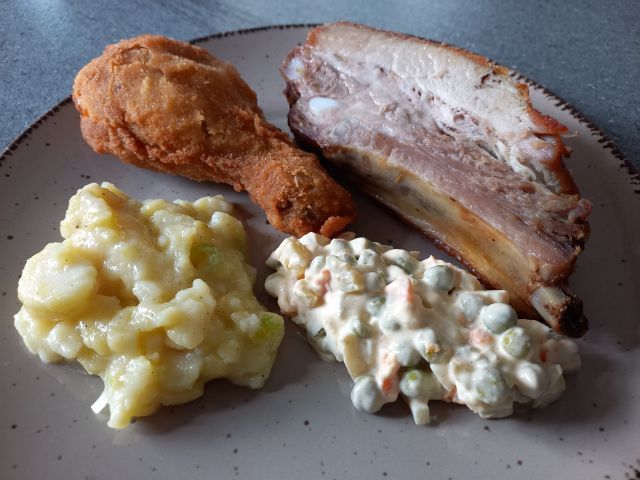 Juhica (od včeraj); sv.rebra, piščančje pohano, francoska, krompirjeva solata (vse reciklaža od včeraj)