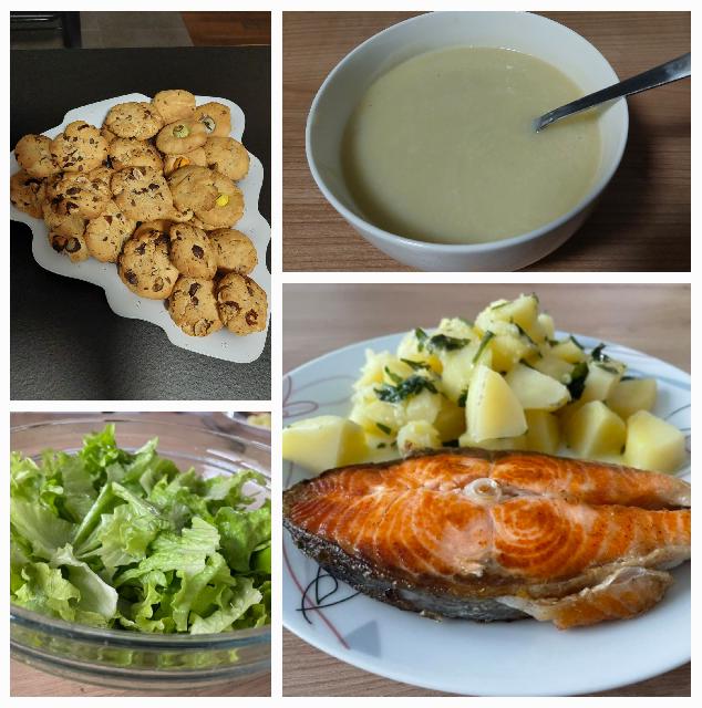 - cvetačna juha, losos, maslen krompir s petršiljem, solata, kukiji