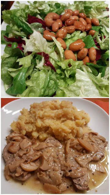 Naravni zrezki ( piščančji, sv.ribica) z gobovo omako ( jurčki), pražen krompir, solata