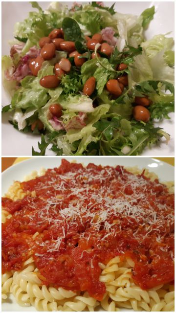 Domača paradižnikova omaka, svedrčki, solata ( domač radič, endivija, motovilec, regrat, kupljena kristalka)
