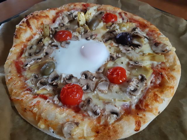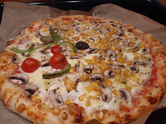 Klasična pica ; pica iz polente, špinače, purana, sir, domači motovilec
