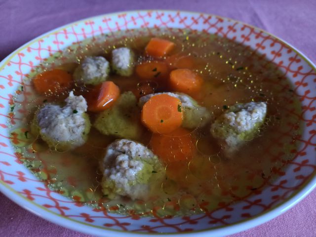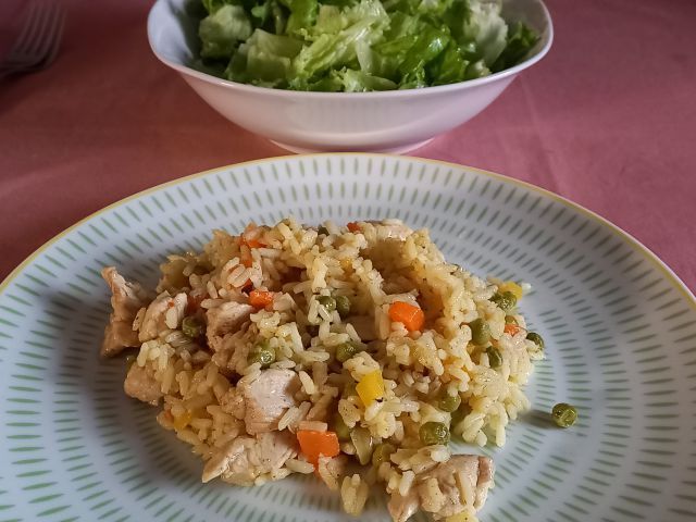 Piščančje/kostna juhica z jetrnimi cmoki; riž z zelenjavo in pišč. mesom (pilav po tur.); zelena solata
