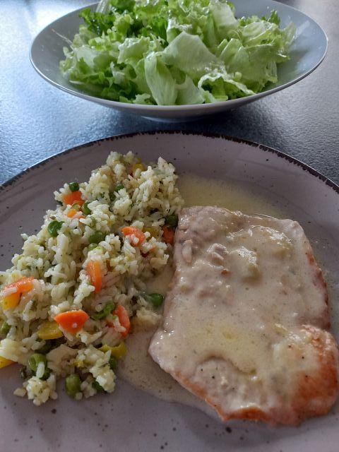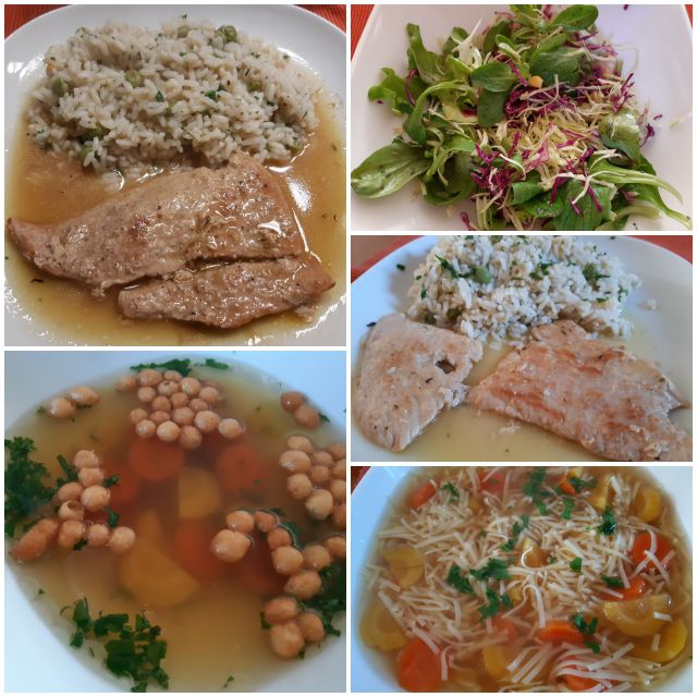 Danes goveja juha z rezanci/ zlatimi kroglicami, zrezki ( svinjski, puranji) v naravni omaki, riži- biži z domačim grahom, solata