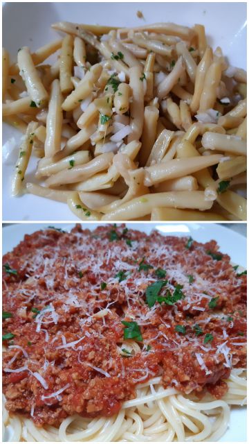 Včeraj špageti bolognese, stročji fižol iz zaloge v solati, zame losos.