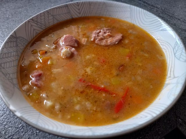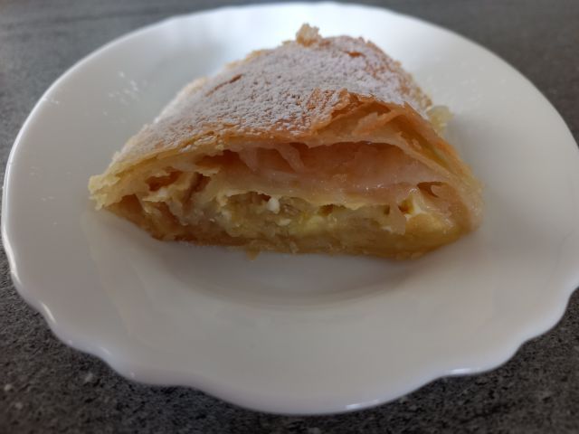 Ričet s klobaso in suho kračo; skutno-jabolčni zavitek; popoldan bo pita: por in krompir, por in meso, ter zelje