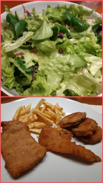 Danes meso po dunajsko, ocvrte bučke, pomfri, solata