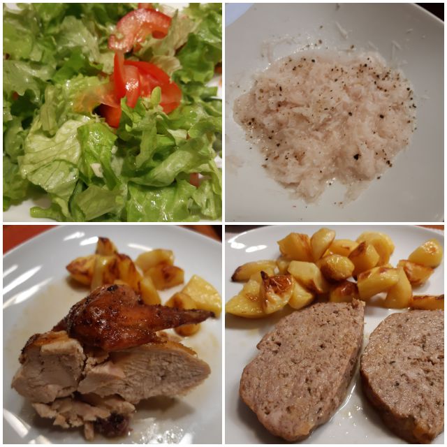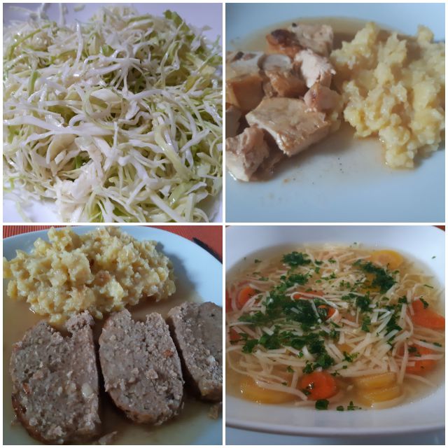 Včeraj goveja juha z rezanci, ostanek pečenke, piščanca, pražen krompir, zeljna solata