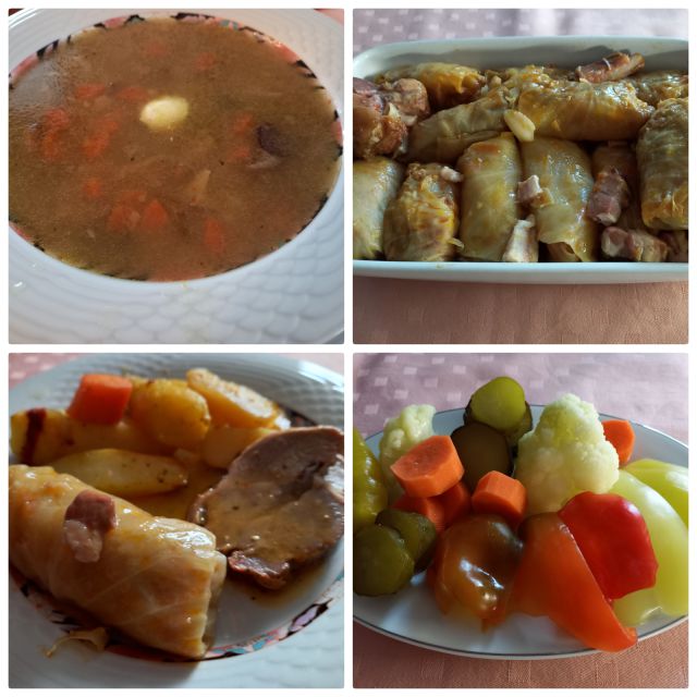 Gobova juhica; sarma, vratovina s krompirjem; kisla zelenjava; kremšnite v kozarcu; jabolčno pecivo