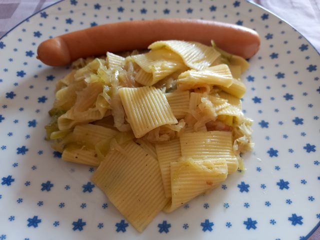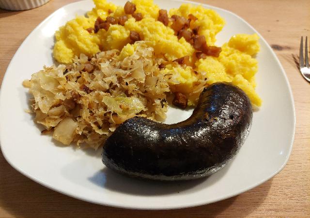 Danes pa krvavice, dušeno kislo zelje, zabeljeni koruzni žganci, zame samo zelje in malo žgancov: