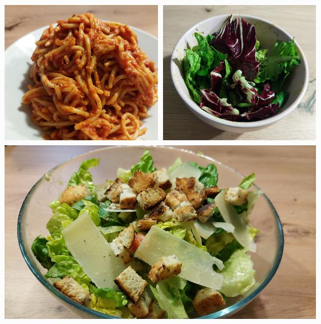 Včeraj za ostale paradižnikovi špageti s parmezanom, solata, zame malo diete (solata s krutoni, parmezanom, avokadom) ker skor ne zapnem več hlač za v službo 😳: