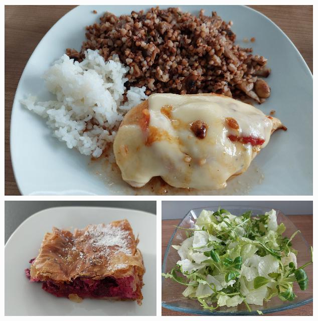 Danes - gobova juha(pozabila slikat), ajdova kaša s šampinjoni, riž, pišč. zrezek po toskansko, mešana solata, višnjev zavitek: