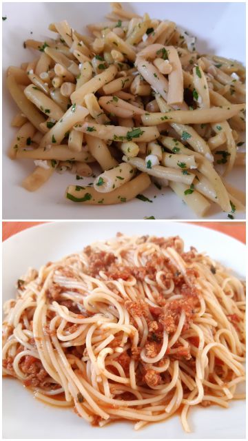 Stročji fižol v solati ( domač, vložen), špageti bolognese
