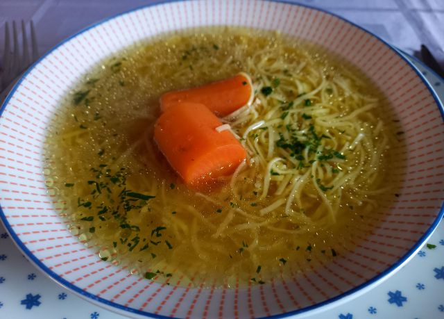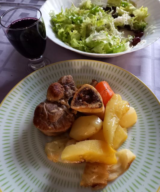 Kostna juhica; telečja krača s krompirjem; zelena solata, zelje s fižolom; tiramisu