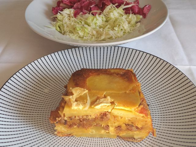 Brzinska juhica; krompirjeva musaka; zelje in radič na solato