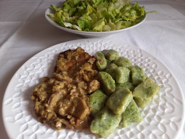 Vratovina v jurčkovi omaki, špinačni njoki; endivija s krompirjem