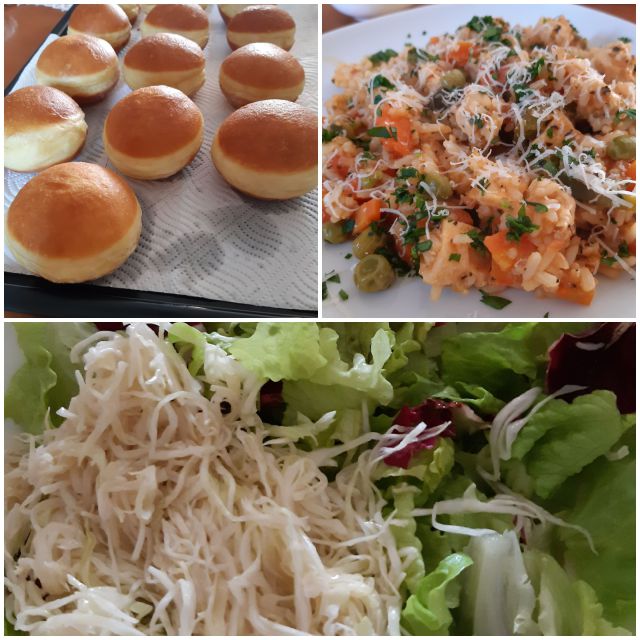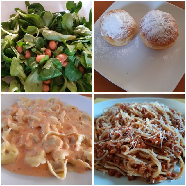 Danes tortelini s sirovo omako, špageti z bolonjsko omako, motovilec s fižolom, krofi