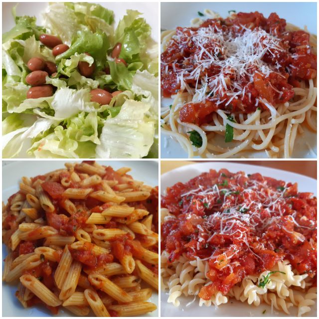 Danes domača paradižnikova omaka iz zaloge s testeninami- brezglutenski s čičeriko, svedrčki in penne rigate in solatas fižolom. Sem poslikala vse tri krožnike![]()