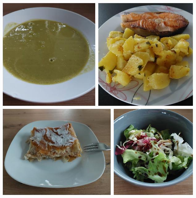 - grahova juha, losos, masleni krompir, včerajšni zavitek