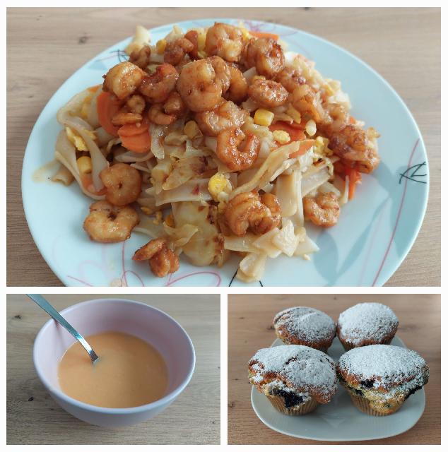 Pad thai s pekočimi rakci, kremna zelnjavna juha, borovničevi mafini ![]()
