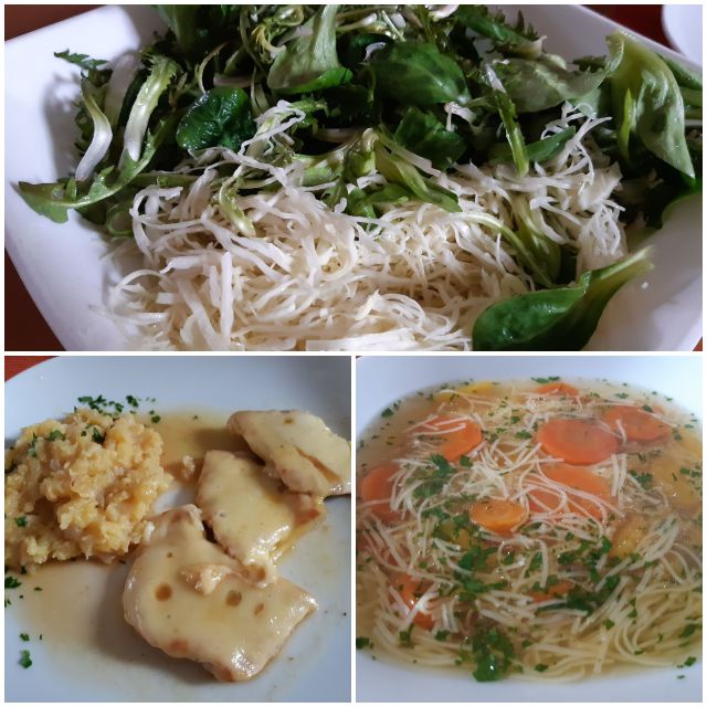 Včeraj goveja juha z rezanci, pražen krompir, zrezki s sirom, zeljna solata z motovilcem in regratom