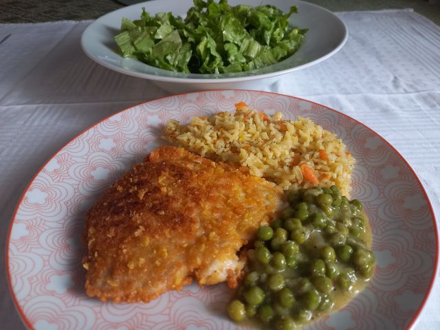 Česnova juhica; basmati riž, grahova omaka, paniran pišč.file; zelena solata
