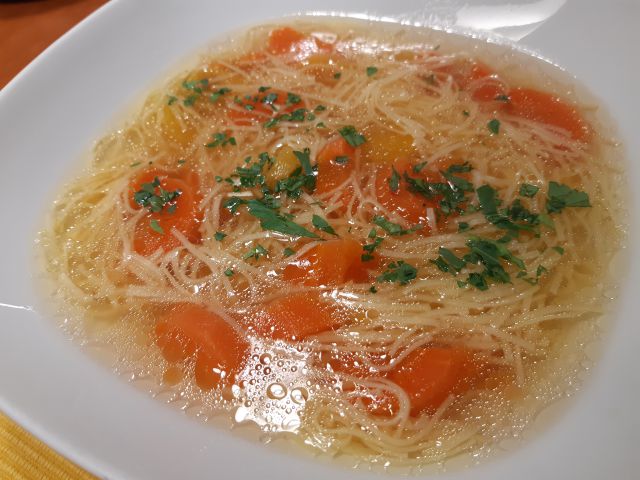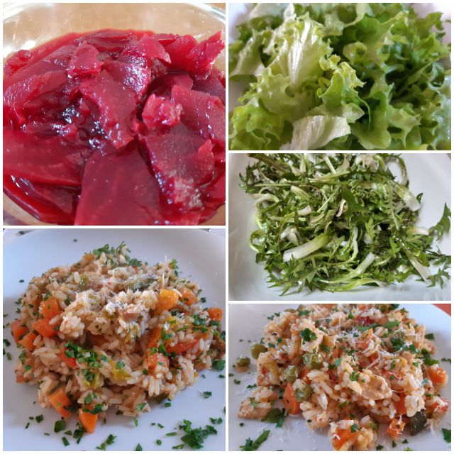 Danes telečja rižota z zelenjavo, piščančja rižota z zelenjavo, zelena solata, rdeča pesa, regrat. Za bolnika zvečer še sveže kuhana goveja juha z rezanci.