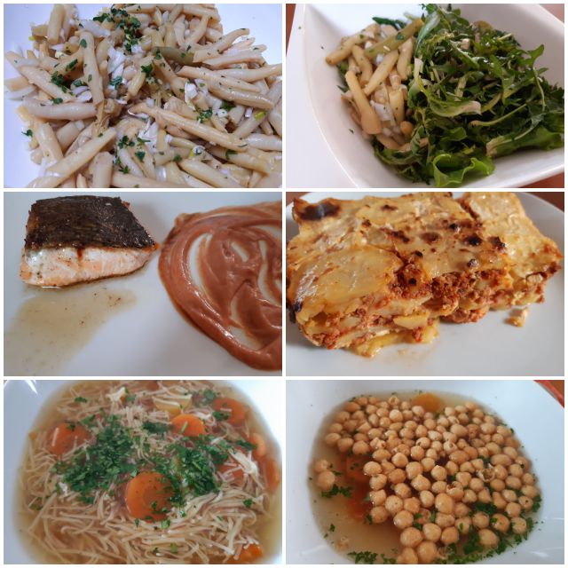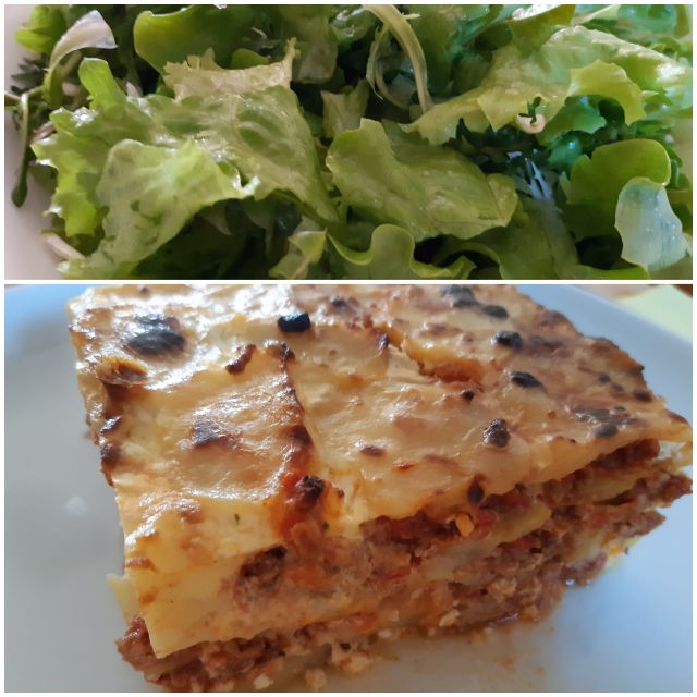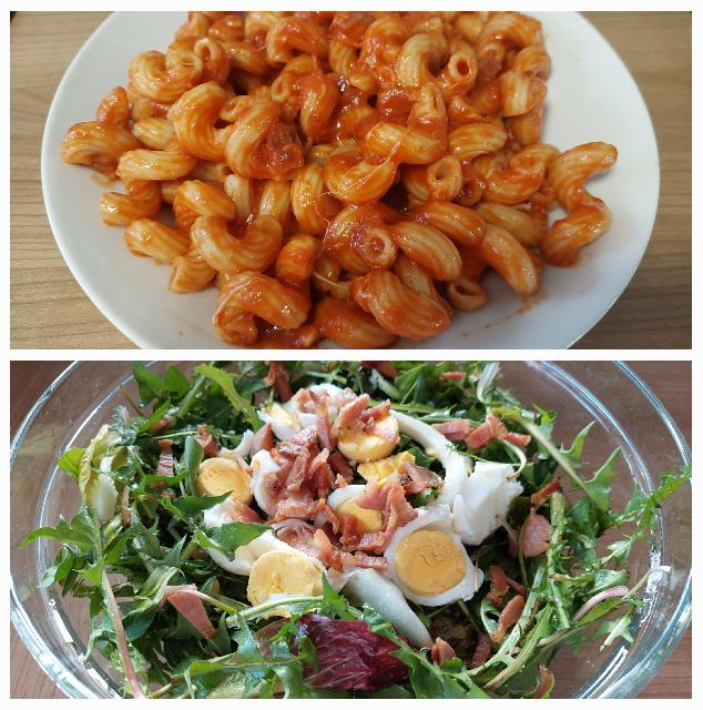 Danes goveja juha ( iz zaloge) z rezanci in zlatimi kroglicami, ostanek musake od včeraj, file lososa zame in omakica, stročji fižol v solati, zame kombiniran z regratom
