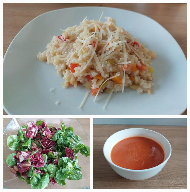 Tole je bilo v torek - paradižnikova juha, zelenjavna rižota, mešana solata s fižolom: